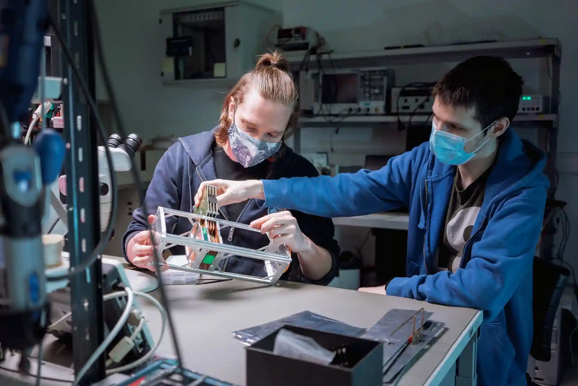 Osa ESTCube-2 meeskonnaliikmeid satelliidi esmaesitlusel 2022. aasta jaanuaris. Foto: Laila KaasikMeie kontaktandmed leiad meeskonna lehelt.
