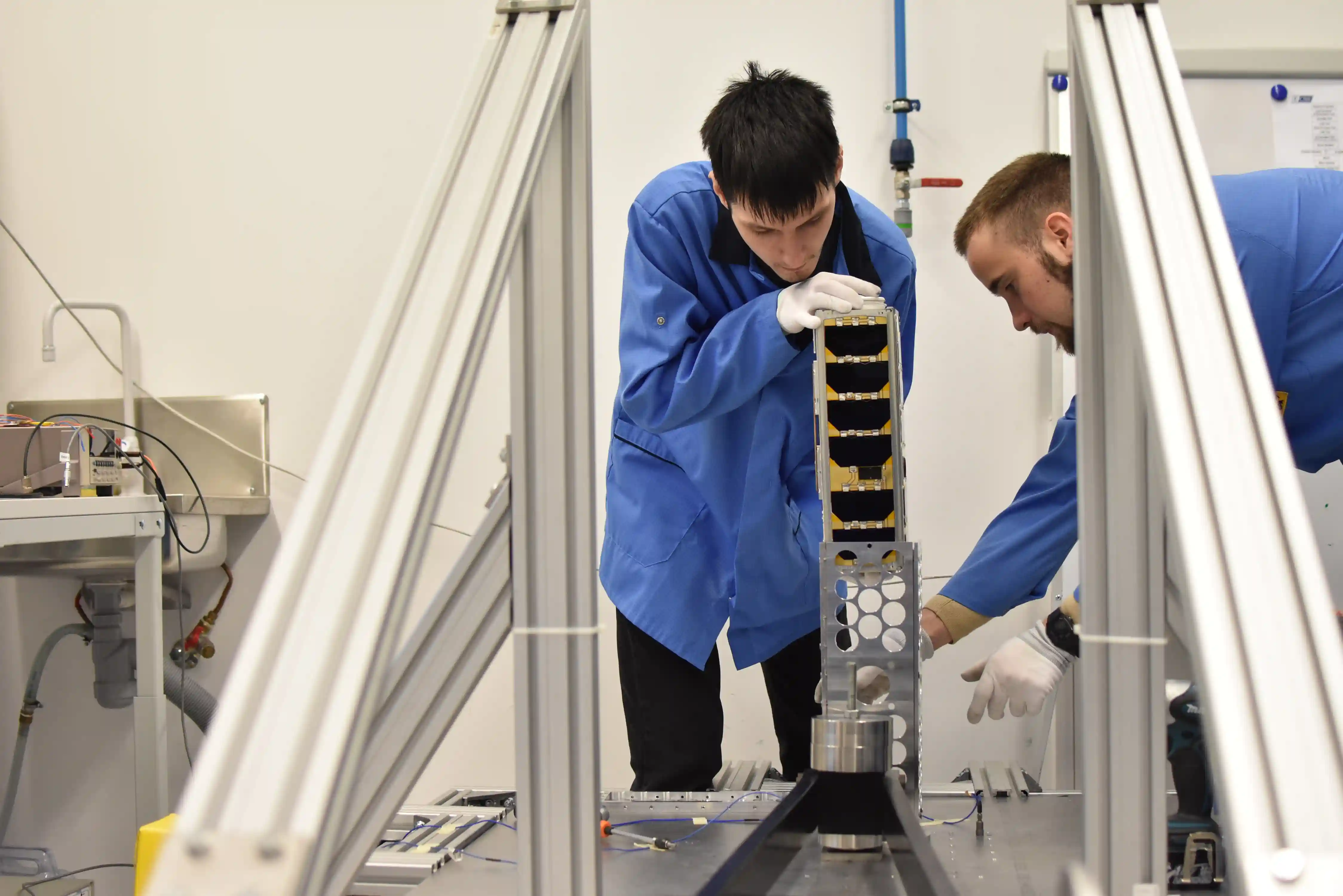ESTCube-2 insenerid sisestamas satelliiti šokitesti rakisesse. Foto: Karin Pai